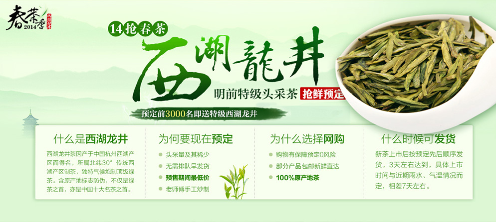 本品采用正品萬擔春AAA特級明前西湖龍井茶,以傳統牛皮紙包裝,盛于藍花布嵌面的木盒之中...